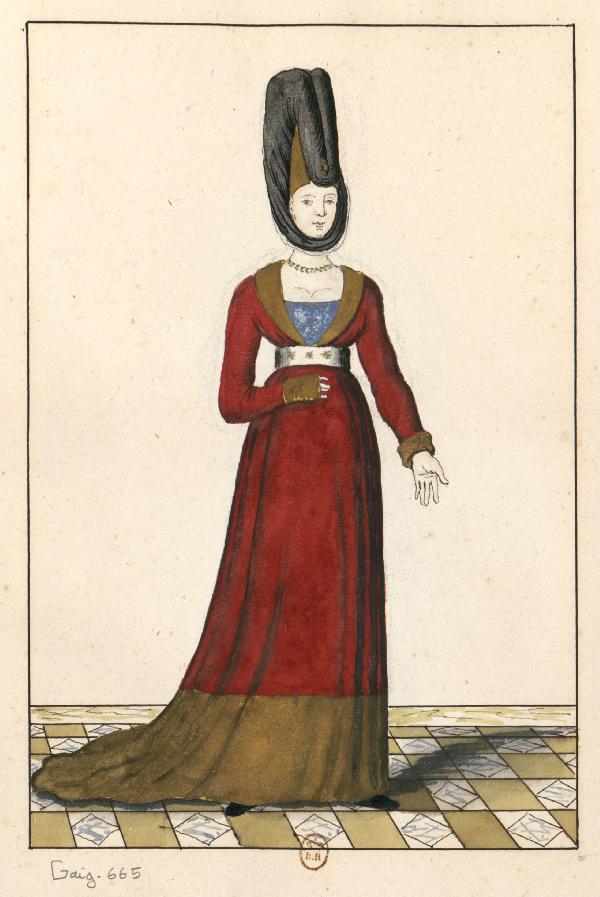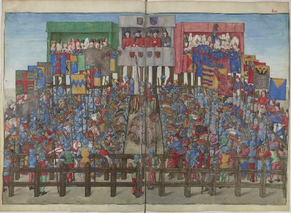 Cette miniature figure dans un volume qui n'a pas appartenu à Gaignières. Elle est proposée pour comparaison comme document source. Une Dame présente dans la tribune de droite a été extraite pour figurer en pied dans un portefeuille des Modes (Bouchot n° 665). Son costume bleu y change de couleur.