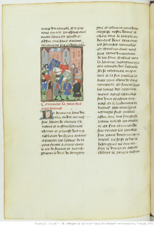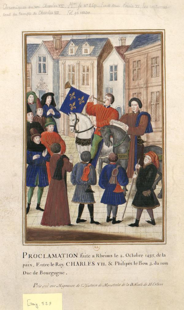 Cette miniature figure dans un volume qui n'a pas appartenu à Gaignières. Elle est proposée pour comparaison comme document source puisqu'elle fut copiée pour être insérée dans un portefeuille des Modes. Le manuscrit médiéval est la Chronique du règne de Charles VII illustrée par Philippe de Mazerolles pour le bibliophile Louis de Bruges vers 1470-1480.