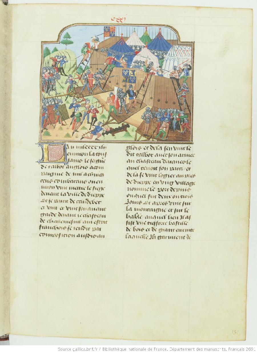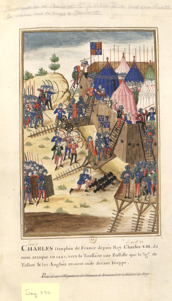Cette miniature figure dans un volume qui n'a pas appartenu à Gaignières. Elle est proposée pour comparaison comme document source puisqu'elle fut copiée pour être insérée dans un portefeuille des Modes. Le manuscrit médiéval est la Chronique du règne de Charles VII illustrée par Philippe de Mazerolles pour le bibliophile Louis de Bruges vers 1470-1480.